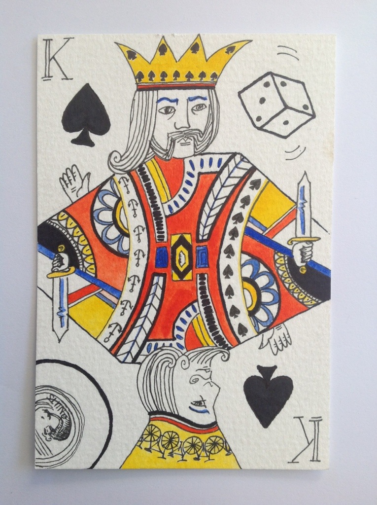 For my postcard, I settled on a representation of the 15th century Parisien king of hearts, supposedly modelled after Charlemagne, the medieval king of the Franks. He’s gotten a modern upgrade in references, mostly inside jokes between friends. Who said that 21st century Charlemagne couldn’t have bikes on his hat and a frisbee? If history tells us anything, is that cards evolve to stay relevant in new times.