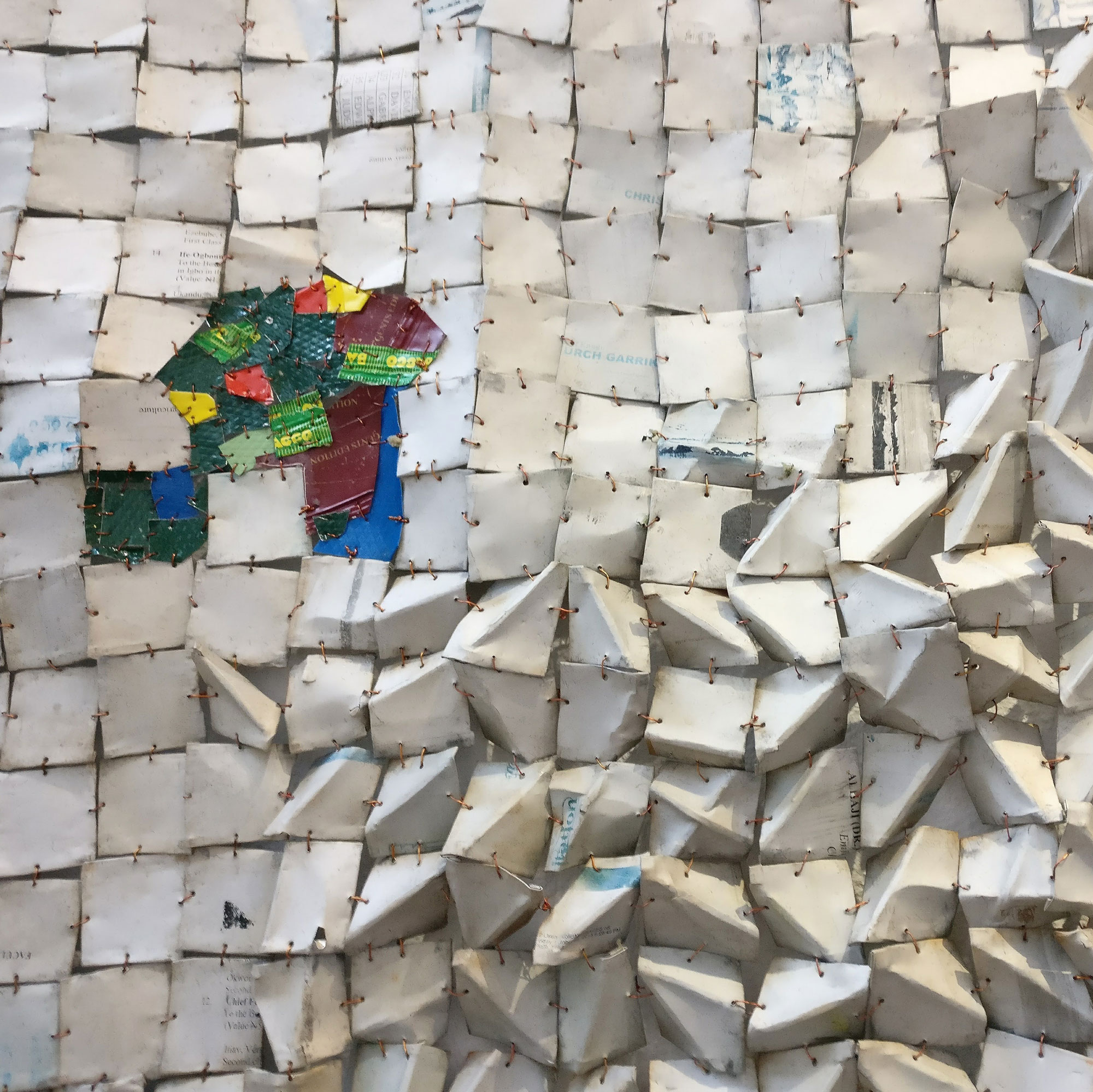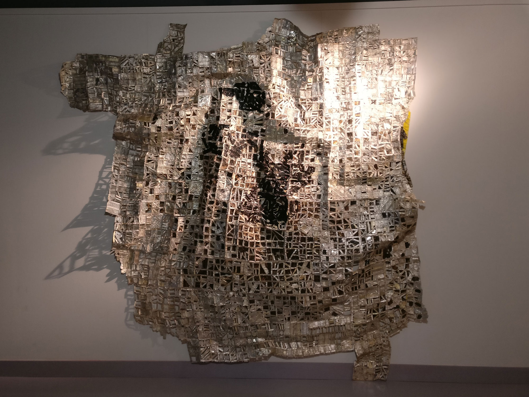 I have read that El Anatsui does not provide instructions to those who receive his work. Curators are therefore given free reign in deciding how to display the work. This open interpretation often leads to a similar outcome, with the tapestries being loosely hung against the wall, highlighting the fluid quality of the work. I’d love to have seen a draping of the work in a more three-dimensional way. There was plenty space in the middle of the room to drape over an object or to maybe even show the backside of the work. The work is sculptural so it would be interesting to see it in its sculptural state.