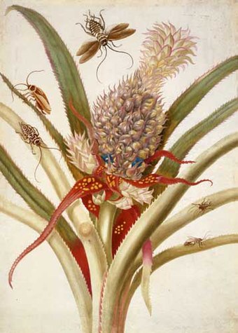In 1699, at fifty-two, Maria set sail for the Dutch colony of Suriname. The plan was to go for five years and document whatever wonders of the insect and plant world they could find. Together with her youngest daughter, she would paddle upstream, into the tropical forest, and search for ‘new’ subjects – like pineapples.